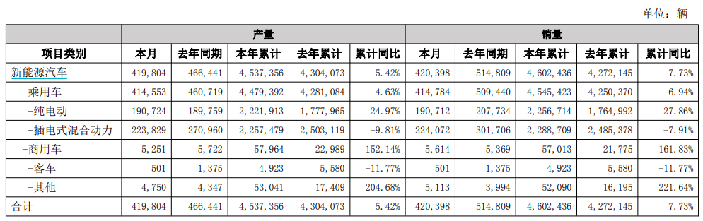 其中,乘用车销量为454.5万辆,同比增长6.94%,商用车销量为57,013辆,同比增长161.83%。纯电动车型累计销量达225.67万辆,同比增长27.86%;插电式混合动力车型累计销量为229万辆,同比下降7.91%。